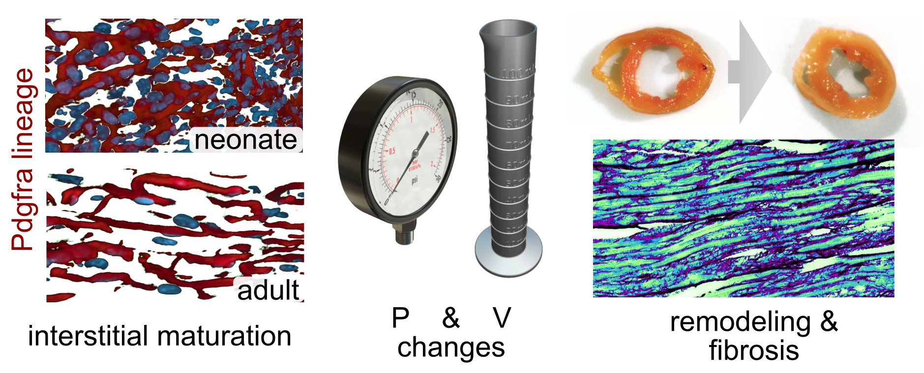 Mechanical signaling pathways that govern fibrosis, adaptation, and failure, integrated across imaging and molecular readouts.